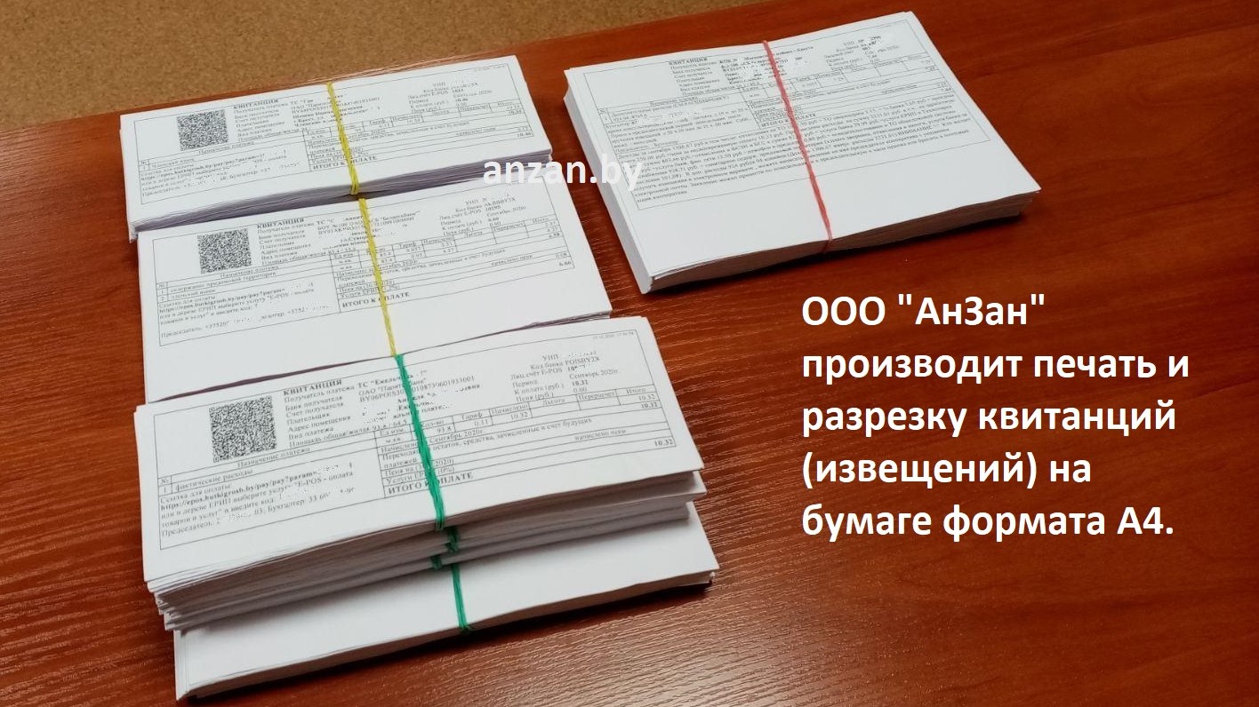 ООО "АнЗан" производит печать и разрезку квитанций (извещений) на бумаге формата А4.